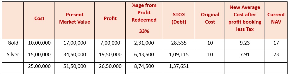 Following are examples of 70% profits in Gold and 130% profit in silver, booking 33% profit and its implications on STCG, new average cost of holding v/s current NAVs. This will give an idea of how much cushion is added due to this exercise: