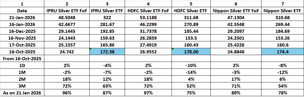 Above table depicts returns for someone who invested at higher premiums on 16th October 25 through ETFs v/s someone who had invested through ETF FoF on the same date. Returns differential even over 3 months or till 21st January 26 is quite substantial, ranging from 6% for 1 day to 5% over 1 month to 6% over 2 months to 9% over 3 months to 9% till 21st Jan 26 from 16th Oct 25 in the case of I Pru example.